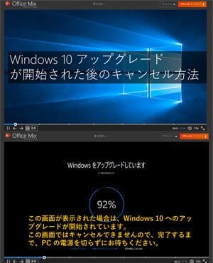 意思に反してWindows 10にアップグレードされてしまったユーザーの苦情が殺到したため、日本マイクロソフトはキャンセル方法を動画で公開した(上)。「Windowsをアップグレードしています」という画面になったら、もうキャンセルはできない。電源を切らずに静かに終わるのを待つ(下)。