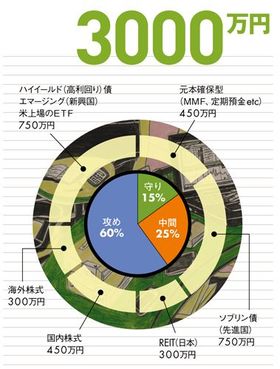 そうした前提を踏まえると、まず3000万円の場合は(1)守り15%、(2)中間25%、(3)攻め60%くらいがよいでしょう。(図を参照)