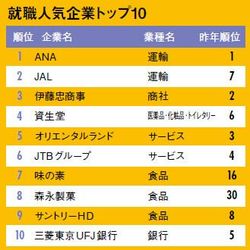 学情が運営する「あさがくナビ」の乾真一朗氏はこう指摘する。例えばANA、JALに次ぐ3位に入った伊藤忠は「採用広報に力を入れています。最近も新聞に岡藤正広社長の若手時代を描いた広告を出すなどしており、学生の間での人気や知名度が高いです」(乾氏)。伊藤忠は昨年から1つ順位を落としたものの、近年、安定して上位に食い込み続けている。