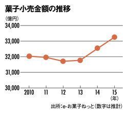 e-お菓子ねっとが発表した調査によると、2015年のお菓子市場の推定小売金額は3兆3254億円だった。12年以降、小売金額は3年連続で増加している。