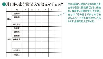 【菅井】基本的なことですが、家計簿を付けるのが一番です。ただし、毎日となると大変。月1回、下に示したようなシンプルな形の家計簿を付けていけばいいでしょう。これによって、1カ月の収支がプラスかマイナスかが分かります。また、項目ごとの支出を把握することで対策も立てやすくなる。体重管理と同じで、状況が可視化されるとモチベーションも上がります。