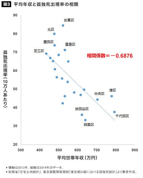 それが何かを突き止めるのは難しいですが、試みに、住民の経済力との関連をみてみましょう。2013年の総務省『住宅土地統計』から23区の平均世帯年収を計算し、2014年の孤独死出現率(図2の右側)との相関をとってみました。図3をご覧ください。