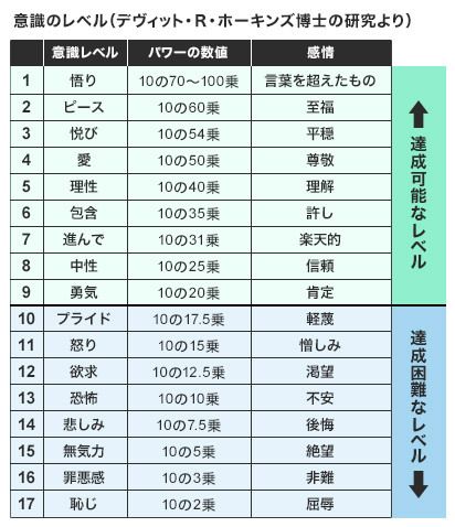 意識のレベル(感情レベル)の確認も大切です(図表参照)。アメリカの精神科医、デヴィッド・R・ホーキンズ博士は、意識には悦び、愛、勇気、怒り、恐怖など、17段階のレベルがあり、意識のレベルによって発するエネルギー値が変わるといいます。がんになる人は「罪悪感」があり、自殺をする人は「恥じ」の意識を持っていることが多いようです。私は、罪悪感、無気力など低い意識のレベルにいる人に対して、カウンセリング中に恐怖を感じさせたり、怒らせたりすることがあります。これはエネルギー値を上げるためにわざと行うテクニックのひとつです。意識のレベルを一気に上げるのは難しいので、少しずつ上に上げて、9の勇気以上の達成可能なレベルにもっていくのです。