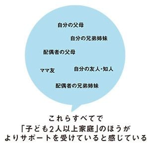 実際、育児のサポートをしてくれている人について調べたところ、先にも書いたとおり、子ども2人以上家庭のほうが子ども1人家庭よりも、「サポートを受けている」と感じているという結果が出てきました。