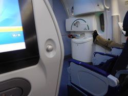 飛行機の中で最も重要な設備でもある、厳重に閉められたハッチに足を乗せてくつろいでいたのです(写真)。狭いエコノミーの席で、少しでも足を伸ばして、ワンランク上の気分を味わいたかったのでしょうか。