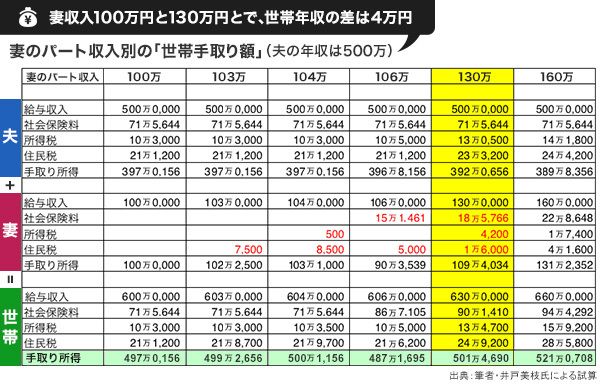 年収130万円になりますと、社会保険料や税金を差し引いた妻の手取りは109万4034円。配偶者に対する控除額が16万円まで下がっていますので、夫の手取りは392万656円となり、世帯全体では501万4690円となります。