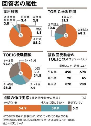 気になるのは、複数回受けて点数が上がるかどうかだろう。複数回受験者に点数を聞いたところ、「伸びている」と答えた人は54.9%で半数を超えた。点数の伸び幅も大きい。平均最低スコアは490点で、平均最高スコアは698点。200点以上の差がある。