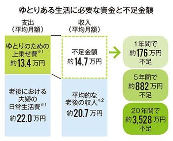 夫婦二人でゆとりあるセカンドライフを過ごすためには、月額35万4000円(※1)が必要だといわれている。一方で退職後の平均収入は、公的年金を中心として月額約20万7000円(※2)。差額の14万7000円は自分で用意しなければならない。現在65歳男性の平均余命が約20年であることを考えると、約3500万円が不足する計算となる(図参照)。