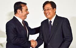 資本・業務提携の共同会見で握手を交わすカルロス・ゴーン日産自動車社長(左)と益子修三菱自動車会長(5月12日/時事通信フォト=写真)。