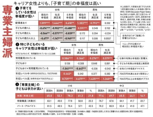 20~30代の「子育て世代」の女性は相対的に幸福度が低く、さらに共働きの女性は専業主婦よりも幸福度が低い。