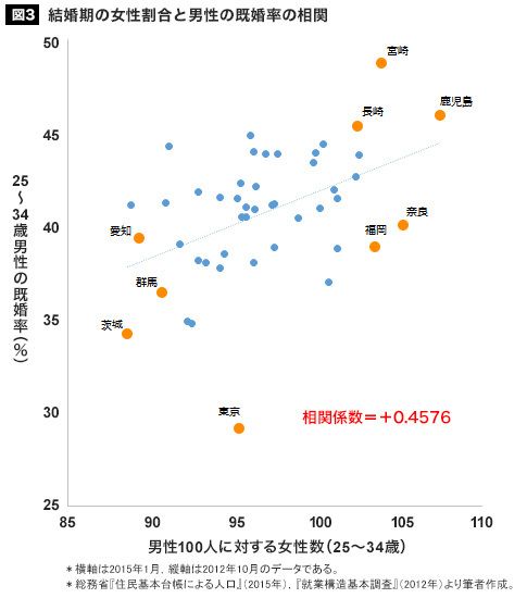 上記の地図の模様から、男性の結婚チャンスは西南にありと思われますが、確かにそういう傾向はあります。25~34歳の男性の既婚率をみると、鹿児島は45.9%で、東京の29.1%よりもかなり高くなっています(2012年、『就業構造基本調査』)。図3は、先ほど出した25~34歳の「女性/男性」比率と、同年齢の男性の既婚率の相関図です。