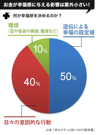 そして、10%の環境にはさらに富や容姿の美醜、健康などの要因があり、全体としてのお金が幸福に与える影響というのは非常に小さいということがわかりました。このことからも、お金がたくさんあることは幸福度に直結するものではないということがわかると思います。