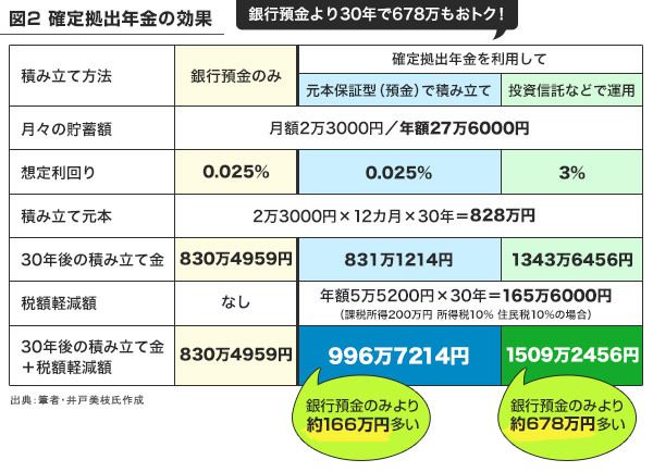 わかりやすくするため少し極端な例を出します。30年間、毎月2万3000円ずつ銀行の定期預金に貯金していく場合(想定利回り0.025%)と、同じく毎月2万3000円を確定拠出年金で運用した場合(想定利回り3%)で試算しています。
