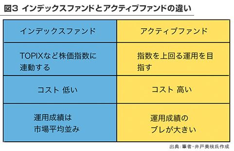 これに対して、指数を上回るパフォーマンスを目指して運用する「アクティブファンド」があるのですが、手数料が高いこと、商品によって運用成績に大きな差があること、などの理由からあまりおすすめできません。