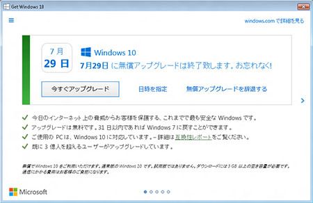 間違いやすいとされる、無償アップグレードの実行画面についてはどうでしょうか? この点について、マイクロソフトは「利用者からの声に基づいて修正を重ねている」という立場をとっており、案内表示も随時変更しています。ただし、アップグレードの実行には規約への明示的な同意(ボタンによるクリック)を必ず求めており、いわゆる“強制的なアップグレード”はないとしています。断言はできませんが、表示をよく読まずに何となくボタンをクリックしてしまった……というケースはあり得るでしょう。