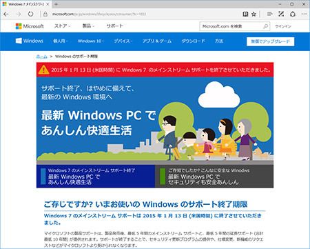 Windows 7の場合はメインストリームサポートが2015年1月13日に終了しているので、新機能の提供はもう行われません。現在は、バグ修正やセキュリティ関係の更新パッチ配布が約束された延長サポートに入っていて、2020年1月14日には終わります。この日を過ぎてもPCは起動しますが、セキュリティの観点からは極めて慎重な取り扱いが必要になります。