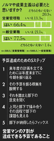 ノルマや成果主義の必要性を、管理職より一般営業職のほうが強く感じているという意外なアンケート結果が出た。仕事が数字で明確に評価されるのが営業という仕事の面白さであり、数値目標を課されることにやる気を感じる営業マンも少なくない。それが結果に結びつかないなら、数字を扱う営業マネジャーのやり方、やらせ方に問題があるのだ。