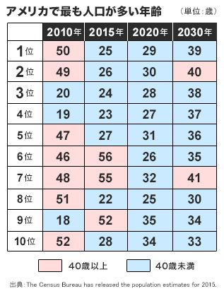 あらゆる経済データは人を裏切るし、政治や経済の見通しを予測するのはほとんど不可能だ。しかし、人口構成だけは裏切らない。アメリカの人口構成を見ると、既に2015年の段階でベビーブーマーはトップ5の年齢にはおらず、大幅な世代交代が進んでいる真っ最中であるとがわかる。そして次の大統領選挙がある2020年になると、25~35歳が中核になり、完全に世代交代が終わる。今、トランプ氏を支持している世代は引退だ。少子高齢化が進む日本とは、状況が違う。