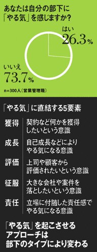 「やる気」というのは便利な言葉である。多くの上司は、自分の嫌いな部下や成果が出ていない部下を「やる気がない」の一言で片付けているという印象を受ける。アンケートの結果、上司の73・7%が「部下にやる気を感じない」と答えているが、そこで、「やる気とは何か?」「やる気を起こさせるために何をしたか?」と聞いて具体的な答えが返ってくることはほとんどない。