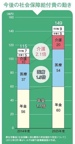 高齢者本人にとっても、周囲で支える家族にとっても、健康の維持は最優先のテーマの一つだ。しかし、それをとりまく状況は厳しさを増している。みずほ銀行産業調査部公共・社会インフラ室の吉田篤弘調査役は、「高齢者を支える生産年齢人口が減少するなか、団塊の世代が75歳を超える2025年には、社会保障給付費の中の医療費は2014年度比で1.5倍、介護費は2.1倍になると見込まれています(グラフ参照)。そこで介護給付の中身も、介護ニーズの高い方、医療ニーズの高い方、認知症の方への重点化・効率化を考えざるを得ない状況です」と語る。