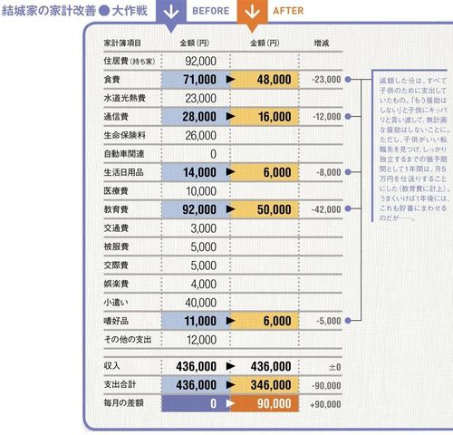 たったそれだけで、月9万円ほどの黒字家計になったのだから驚きだ。5万円の援助金も打ち切ればさらにその額が増えるのだが、過保護気味な結城さんにそれができるかどうか、そこが問題だ。