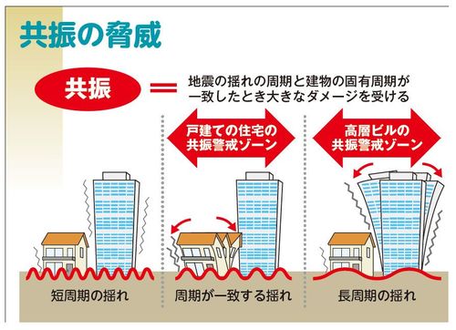 となれば、長い周期の揺れは、固有周期の長い高層の建物と共振して大きな揺れを発生させ、短い周期の揺れは固有周期の短い住宅と共振して、やはり揺れを増大させる。共振という現象に逃げ道はないということだ。