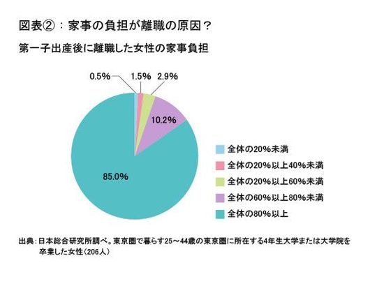 日本総合研究所のアンケート調査結果によれば、第一子出産後、離職をした女性のうち、「全体の家事の80%以上を自ら行っている」と回答した女性は、85.0%に上ります(図表2)。要するに、家事のほとんどを、ほぼ自分ひとりでやっているということになります。