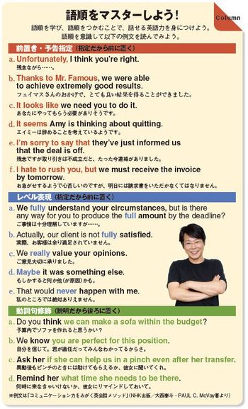 「『ピンチのときに助けてもらえるか、彼女に聞いてくれ』を英語にするときは、Ask herという動詞句を思い浮かべ、後からそれを修飾するif she can help us in a pinch.をつなげる。ここでは動詞句が主食、if節がおかずと考える。おかずは常に後ろにつながるわけですが、この語順どおりに意識を動かす訓練が必要です。日本語から英語へ、英語から日本語へ訳すことをやめ、英語の語順で考える訓練をしましょう。使いこなせない表現があったらメモをとり、語順を頭に叩きこむ。語順や文法を忘れるくらいにそれを徹底すれば、ビジネスパーソンの皆さんなら、英語を話せるはずです」