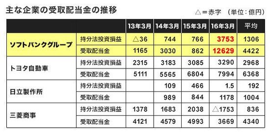ソフトバンクグループは、シンガポールの子会社からの配当金が反映される17年3月期も含めれば金額が膨れ上がることはまちがいないが、12年度~15年度の4期を均すと、1事業年度平均は4422億円という計算になる。これは日立製作所(国際会計基準を採用の3期平均)の1004億円を大幅に上回り、三菱商事とほぼ同水準だ。