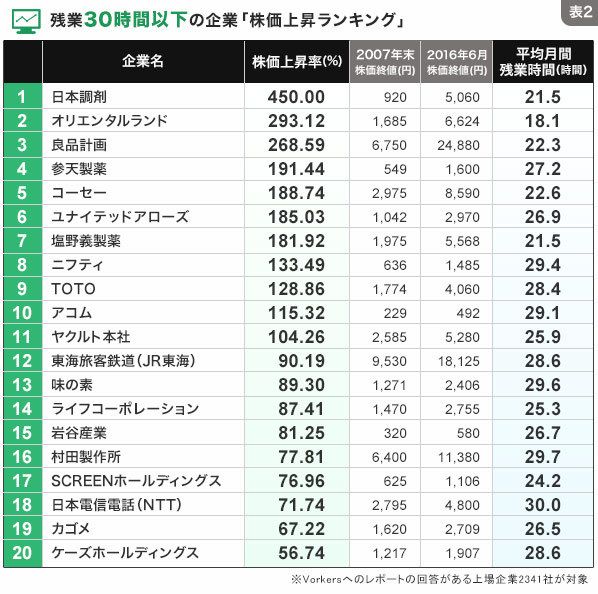 1位は07年末から16年6月末までの株価上昇率が450.00%の日本調剤、2位は同293.12%のオリエンタルランド、3位は同268.59%の良品計画となった。日本調剤についての口コミでは「正社員も育児休暇取得後は時間短縮をして勤務でき、残業の無い準社員という働き方もある。また週3日の午前中勤務などパート社員としての働き方もある。それぞれ柔軟に行き来できる」、オリエンタルランドについては「基本的に事前に申告すれば休暇は容易に取得でき、社員の間で非常に印象の良い風土として評価されていた。残業もこちらが無理と言えば発生しない」、良品計画については「業務の無駄があれば意見を出してすぐに改善しようという風土がある」といった口コミがあった。口コミからもこれらの企業がワークライフバランスに配慮していることが分かる結果になった。