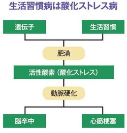 そこで山門氏は「内臓脂肪の蓄積と体内の酸化度の上昇が、体内の酸化バランスを崩し、動脈硬化を促進する」との仮説を立て、それを立証した。