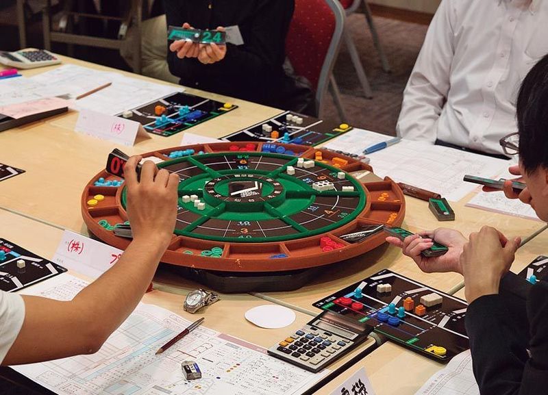 (1)プレーヤーは1卓に4~6人。一人ひとりが企業の社長となる。製造業版の場合、何を作る会社にするかは自分でイメージし、仕入れから生産、販売までマネジメントする。