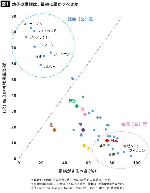 国際社会調査プログラム(ISSP)の『家族と性役割の変化に関する調査』(2012年)では、各国の国民に対し「就学前の乳幼児の世話は、最初に誰がすべきか」と尋ねています。5つの選択肢が用意されていますが、各国を分かつ主な軸は「家族か、政府機関か」です。