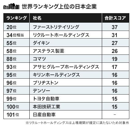 国別では41社がアメリカ企業でトップ、日本企業は20位のファーストリテイリングを筆頭に10社がランクインし、国別では2位となりました(リスト参照)。