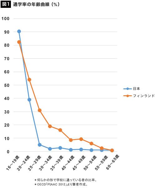 青年期までの時期に教育機会が集中している(偏っている)様は、通学率の年齢曲線を描くとよく分かります。図1は、日本とフィンランドの比較です。