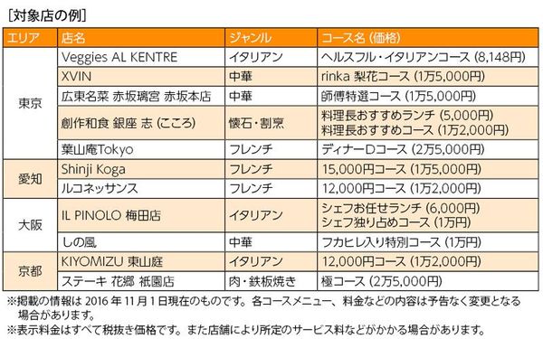 ここで役立つのが「ダイナースクラブ エグゼクティブ ダイニング」。対象のレストランで会員を含む2人以上で所定のコース料理を頼むと、1人分のコース料金が無料になるという何とも太っ腹のサービスだ。対象店は全国250店以上。中には6人以上のコース料理の注文で2人分が無料になる店もあり、納会や同窓会など大人数での食事時にさらに役立つ。「食事を楽しむ人(ダイナース)」が名の由来というだけあり、まさに食の分野で無類の強さを発揮するのがダイナースクラブだ。
