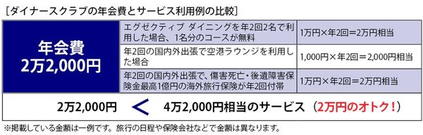 ダイナースクラブの年間費は2万2,000円(税抜き)~と、年会費無料なども登場している昨今のクレジットカード事情の中にあって費用が発生することは確かだ。しかし、これまで紹介したような手厚いサービスが受けられるのであれば決して高いということはないだろう。サービスをうまく活用すれば年会費を簡単にカバーできる。例えばこんな具合だ。
