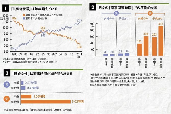 共働きと専業主婦では、生涯所得に大きな差が生まれる。男女共同参画白書によれば、共働き世帯と専業主婦世帯は1990年代半ばに逆転し、その後は差が開く一方だ。2014年の共働き世帯は1077万世帯で、専業主婦世帯の720万世帯を大きく上回っている(図1)。