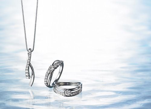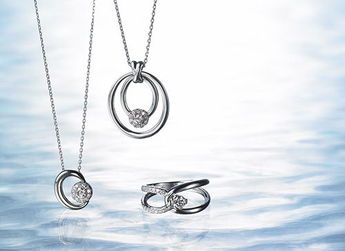 古くから永遠の象徴とされるサークルフォルムを特徴とするエレガントな印象のジュエリー。ダイヤモンドを支えるようなプラチナのデザインを夫婦の絆のシンボルとして贈る。●すべてPt×ダイヤモンド。ネックレス(左)[0.15ct]17万円。ネックレス(右)[0.15ct]23万円。リング[センター0.18ct、サイド0.14ct]28万円〈すべてジュエラーズジャパン〉