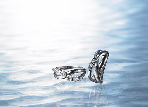 どんな困難も乗り越えてきた夫婦二人の紐帯を感じさせるような、シンボリックなデザインのリング。細部まで丁寧に磨かれた滑らかな曲面、そしてそこに生まれる気高くも優しげな光沢はほかならぬプラチナ・ジュエリーならでは。●ともにPt×ダイヤモンド。リング(左)[1.00ct] 18万5000円。リング(右) 9万2575円〈ともにツツミ〉