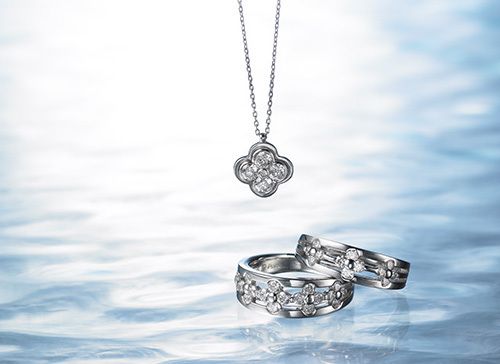 四つ葉のクローバーをモチーフとしたプラチナ・ジュエリー。高貴なプラチナの中にキュートさを詰め込んだこんなジュエリーは、乙女心を忘れない茶目っ気あふれるパートナーにこそ贈りたい。●すべてPt×ダイヤモンド。ネックレス[0.50ct]27万円。リング(左)[0.70ct]35万円。リング(右)[0.35ct]24万円〈すべてカシケイ〉
