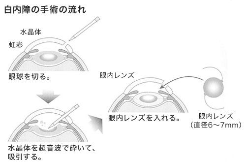 検査によってもし白内障だと分かった場合、その治療は点眼薬で進行を止めるか、手術をするかのいずれかになります。白内障の手術とは、水晶体を人工のレンズに交換すること。手術自体は10~30分程度で終わりますが、人工のレンズは水晶体と違って厚みが変わらないので、完全な老眼状態となります。