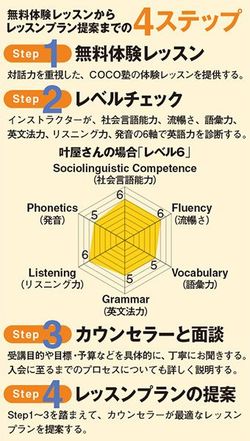 「英語力が落ちているのを実感しました。今すぐに使わなくても自分の英語力をなんとかキープしたい。COCO塾に入会したのはその一心からでした」と叶屋さんは振り返る。COCO塾の無料体験レッスンでは、インストラクターがネイティブスピーカー本来の速度で話し、入会希望者の英語レベルを6つのスキルから厳密に判定する。叶屋さんへの判定は、中級クラスの「レベル6」だった。