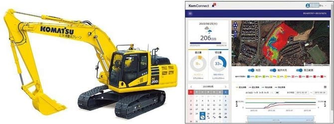 (左)最新型のマシンコントロール油圧ショベル「PC200i-10」。(右)コマツのクラウドサービス「KomConnect」のサービス画面。「盛土量」「切土量」として進捗が「%」で表示されているのがわかる。