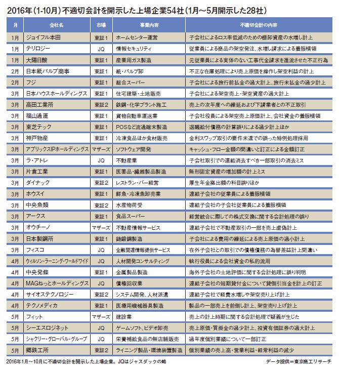 #不適切会計 #東芝 2016/12/26 9:00 東芝だけじゃない!「不適切会計」上場54社の社名公開 PRESIDENT Online 橋本 邦夫 +フォロー 東京商工リサーチ情報部 前ページ 1 2 3 4 次ページ 次ページ 1 2 3 4 関連記事 山一證券、ソニー、東芝「沈没する会社の共通点」 東芝、ライブドア、オリンパス……、歴史に残る華麗なる粉飾テクニック なぜ「不正会計」は永遠になくならないか ランキング 1位 「男性だらけの会議」では絶対に気づかない…女性自衛官が災害現場で真っ先に提案した“2つの生活必需品” ランキングをもっと見る ビジネス #不適切会計 #東芝 #経理 #コンプライアンス