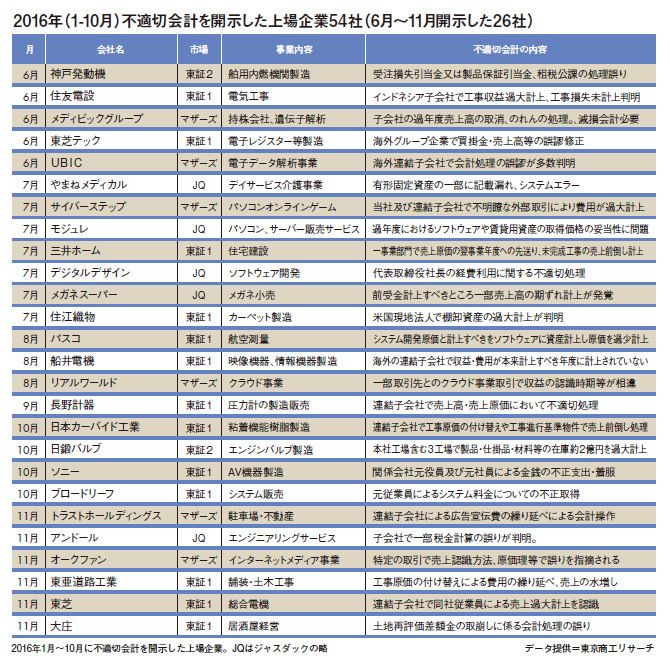 #不適切会計 #東芝 2016/12/26 9:00 東芝だけじゃない!「不適切会計」上場54社の社名公開 PRESIDENT Online 橋本 邦夫 +フォロー 東京商工リサーチ情報部 前ページ 1 2 3 4 【関連記事】 山一證券、ソニー、東芝「沈没する会社の共通点」 東芝、ライブドア、オリンパス……、歴史に残る華麗なる粉飾テクニック なぜ「不正会計」は永遠になくならないか 社外取締役は日本企業をダメにする 解明! なぜ「東芝の悲劇」が繰り返されるのか 1 2 3 4 橋本 邦夫(はしもと・くにお) 東京商工リサーチ情報部 関連記事 山一證券、ソニー、東芝「沈没する会社の共通点」 東芝、ライブドア、オリンパス……、歴史に残る華麗なる粉飾テクニック なぜ「不正会計」は永遠になくならないか ランキング 1位 「男性だらけの会議」では絶対に気づかない…女性自衛官が災害現場で真っ先に提案した“2つの生活必需品” ランキングをもっと見る ビジネス #不適切会計 #東芝 #経理 #コンプライアンス