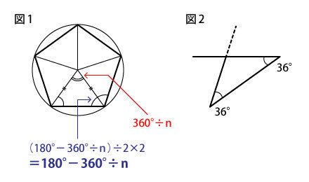 正5角形を描いてみると、中に二等辺三角形が5つ入っていることがわかる。二等辺三角形の頂角は「360°÷5」だ。次に底角は、三角形の内角の和180°から頂角を引いて、2で割った(180°-360°÷5)÷2で算出できる。正五角形の内角は、この底角2つぶんになっているから、(180°-360°÷5)÷2×2となる。÷2×2は打消しあっているので、カット。これを正n角形に置き換えると、次のような式になる。