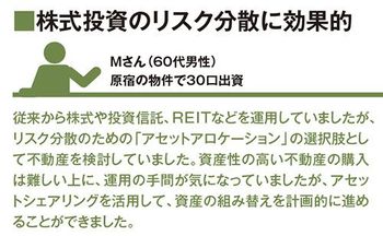 さらに小口化されて分割しやすい点も、相続では有利に働く。実物不動産は本来、平等な資産分割が難しい。例えば土地は分割すると面積が小さくなって価値が下がってしまうし、ワンルームマンションは物件によって日照や眺望、間取りなどの条件によって不平等が生じてしまう。これが相続においてはもめ事の種になる。その点「アセットシェアリング」なら、相続人同士がまったく同じ条件で、かつ簡単に口数の分割ができるというわけだ。