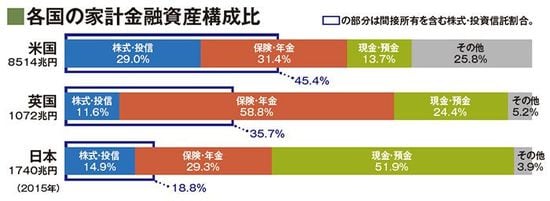 【黒田】「リスク=危険」と思いがちですが、金融の世界におけるリスクとは、投資した結果得られるリターンの幅の可能性、つまり不確実性のこと。プラスもマイナスも両方あり、単に避けるべきものではありません。ただ、日本においては投資の成功体験を持つ人がまだまだ少ない。これは、金融庁が出している「平成28事務年度 金融行政方針」などでも指摘されています。だからどうしても、「リスクが怖い」となってしまうのだと思います。実際、各国の家計金融資産構成比を見ても、日本は「現金・預金」の占める割合が50%超。これが英国では25%以下、米国では14%以下です(グラフ参照)。