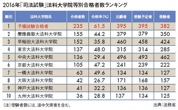 そして、もう一つ際立ったのが“予備試験組”の躍進で、235人の合格者数は全体の14.8%を占めた。また、その合格率は61.52%に達し、ロースクールで合格者数トップである慶応義塾の44.29%を大きく引き離した。さらに、合格者235人のうち、ロースクール在学中が86人、大学在学中が69人もおり、「法曹を目指す優秀な現役の学生なら、ロースクールの修了で受験資格を得るよりも、予備試験を選んだほうが近道」という見方を裏付ける結果となったのである。